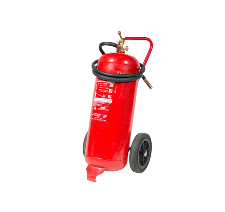 Extintor gran tamaño tipo carro diseñado para desplazarse con gran cantidad de agente extintor polvo ABC a la zona del fuego.